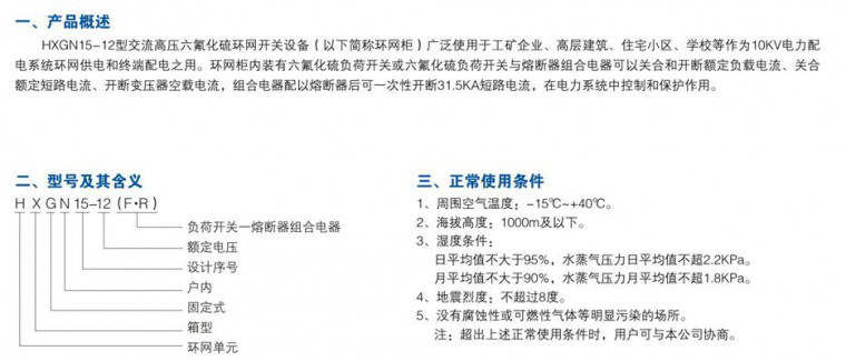 HXGN15-12系列環網柜適用于城市電網改選和建設需要的新一代高壓電器產品。內部元件均選用國內目前先進產品。該產品經形式試驗和長期的運行考核,并有滿足二次要求的可靠防誤操作措施。防護等級達到IP2X,且具有體積小,重量輕、操作簡單、操作環網柜適應于廠礦、住宅小區、高層建筑、學校、公園等場所的三相額定電壓10kV、額定頻率50Hz的配電系統,作為接受和分配電能之用??捎糜诃h網供電和終端供電,也可裝在箱式變電站中。